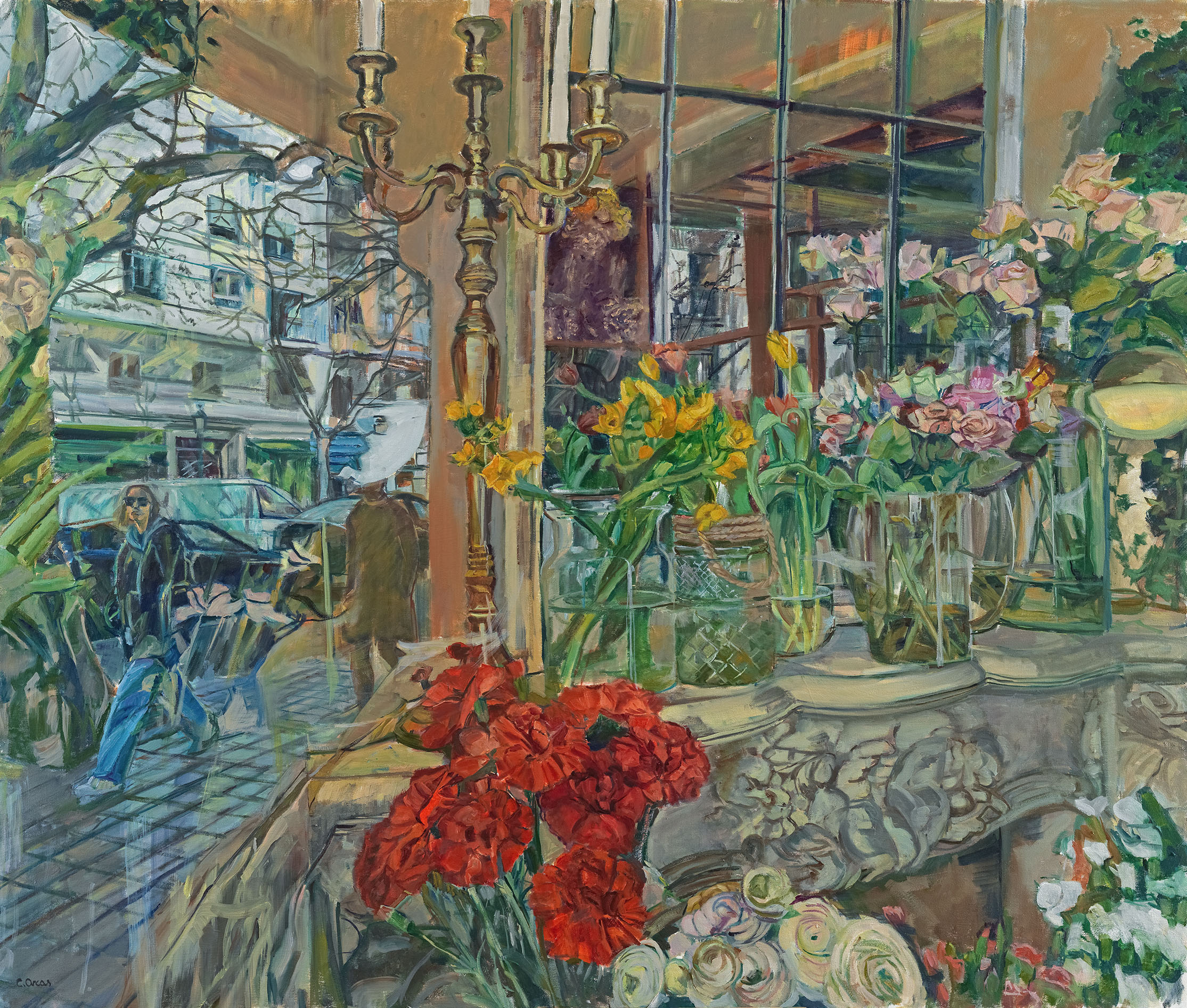 Uzun yıllardır İstanbul’da yaşayan ve üreten Claire Arkas’ın yetenekli fırçasının renklere hâkimiyeti hemen göze çarpıyor. Ağaçların havuza yansıdığı, yeşil ile mavinin kucaklaştığı, birbirlerinin içinde eridiği ‘Yeşil Yansıma’ tablosu buna örnek.